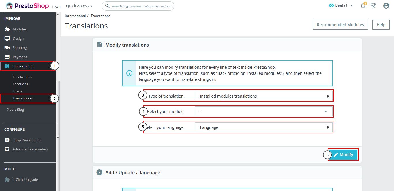 - Note: To find more informations, please read on http://doc.prestashop.com/display/PS17/Translations