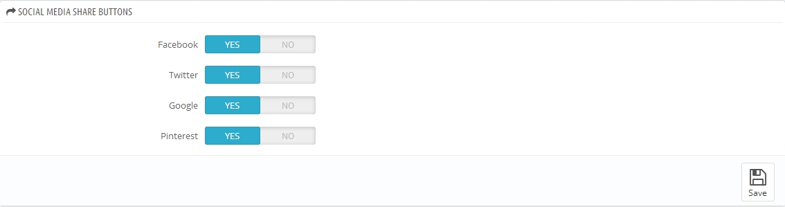 Social media share buttons displays social media sharing buttons (Twitter, Facebook, Google+ and Pinterest) on every product page